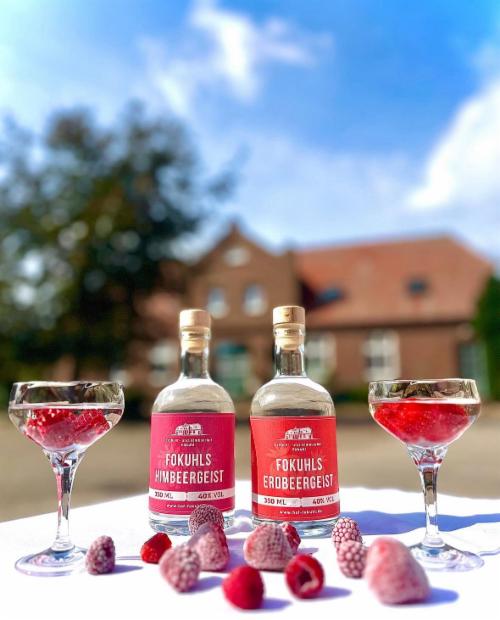 - Besonders stolz sind wir auf unsere 40 %igen Erdbeer- und Himbeergeiste, die aus eigenen Früchten hochwertig destilliert wurden.